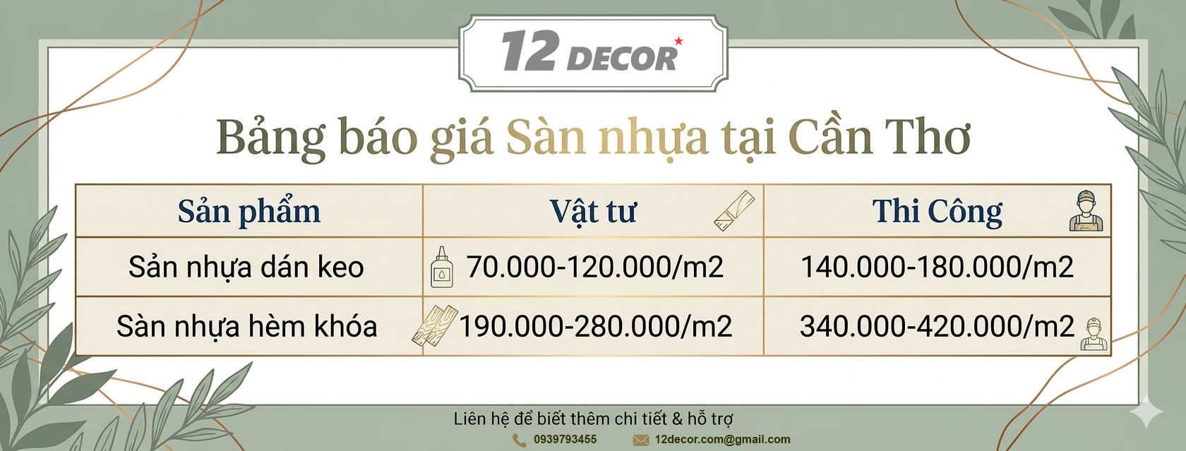 👉 Với dịch vụ 12 Decor, khách hàng có thể yên tâm khi lựa chọn sàn nhựa Cần Thơ – thi công sàn nhựa Cần Thơ chất lượng, giá hợp lý và bảo hành rõ ràng.