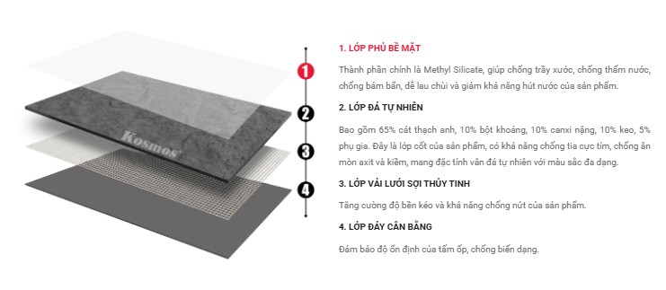 → Hỗn hợp bột đá tự nhiên + polymer giúp tấm vừa chắc chắn vừa dẻo.